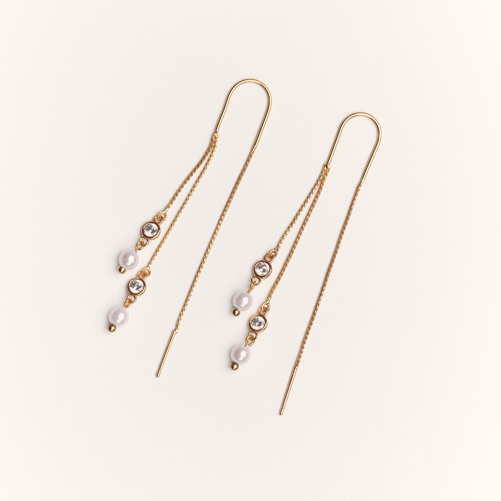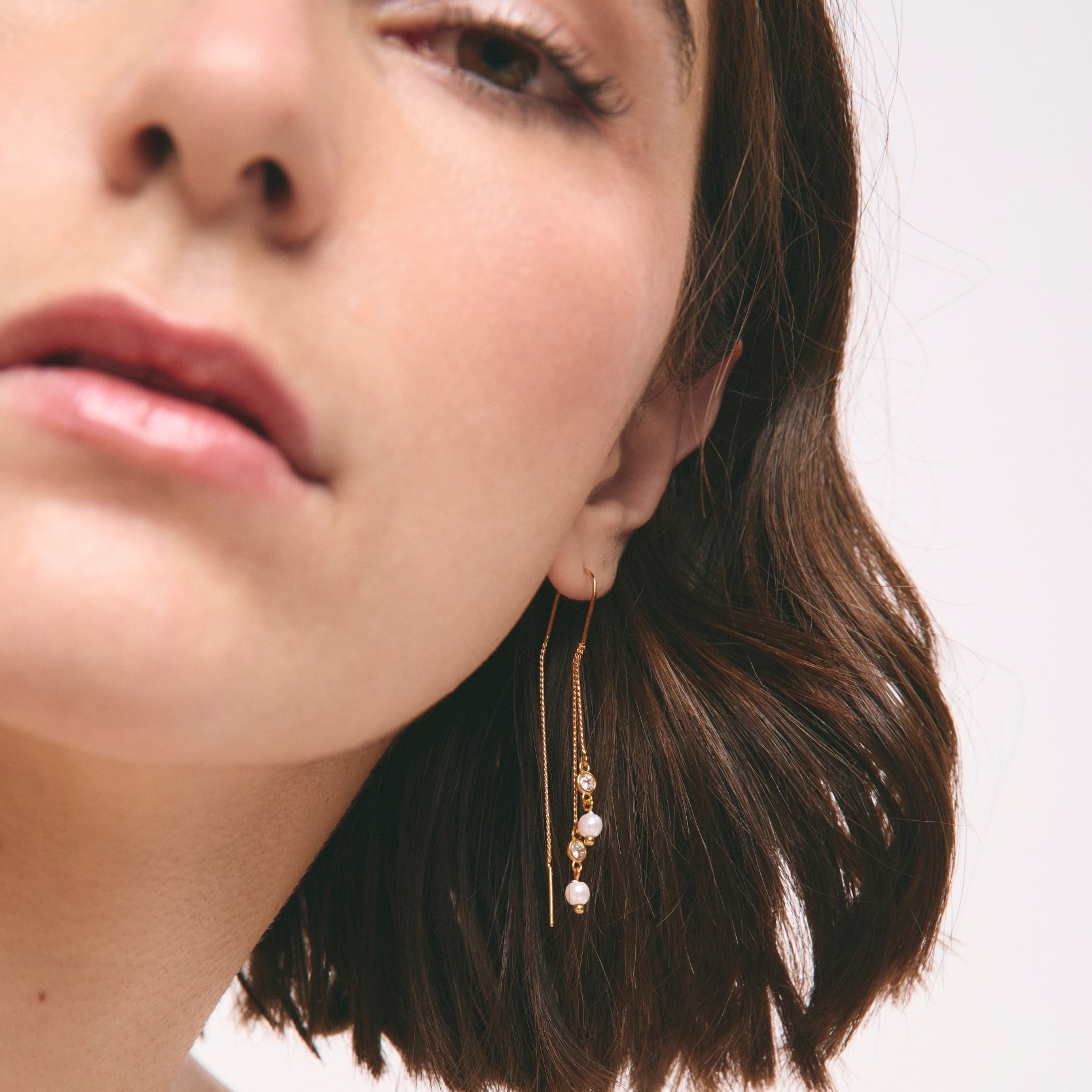 Este arete tipo pasador se desliza a través de la oreja y se ve doble, creando ese efecto de cadena fina que cae y se mueve con cada paso.
