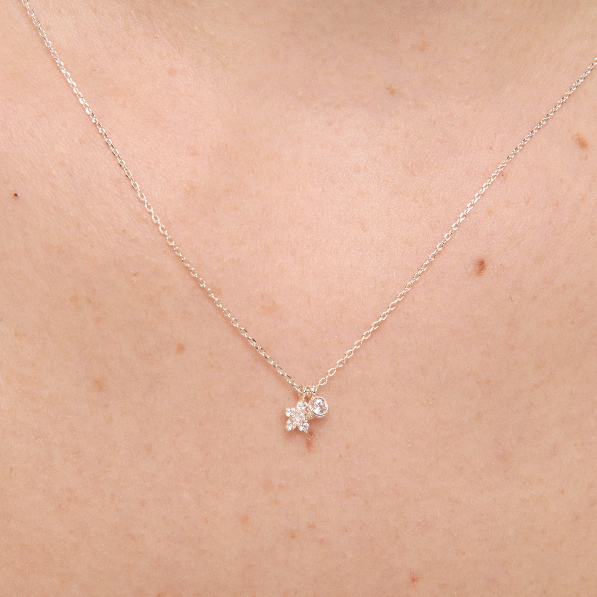 Una mini flor de cristales —la misma del arete a juego— cuelga junto a un punto de luz pequeño, creando un dúo sutil que brilla justo donde tiene que brillar.