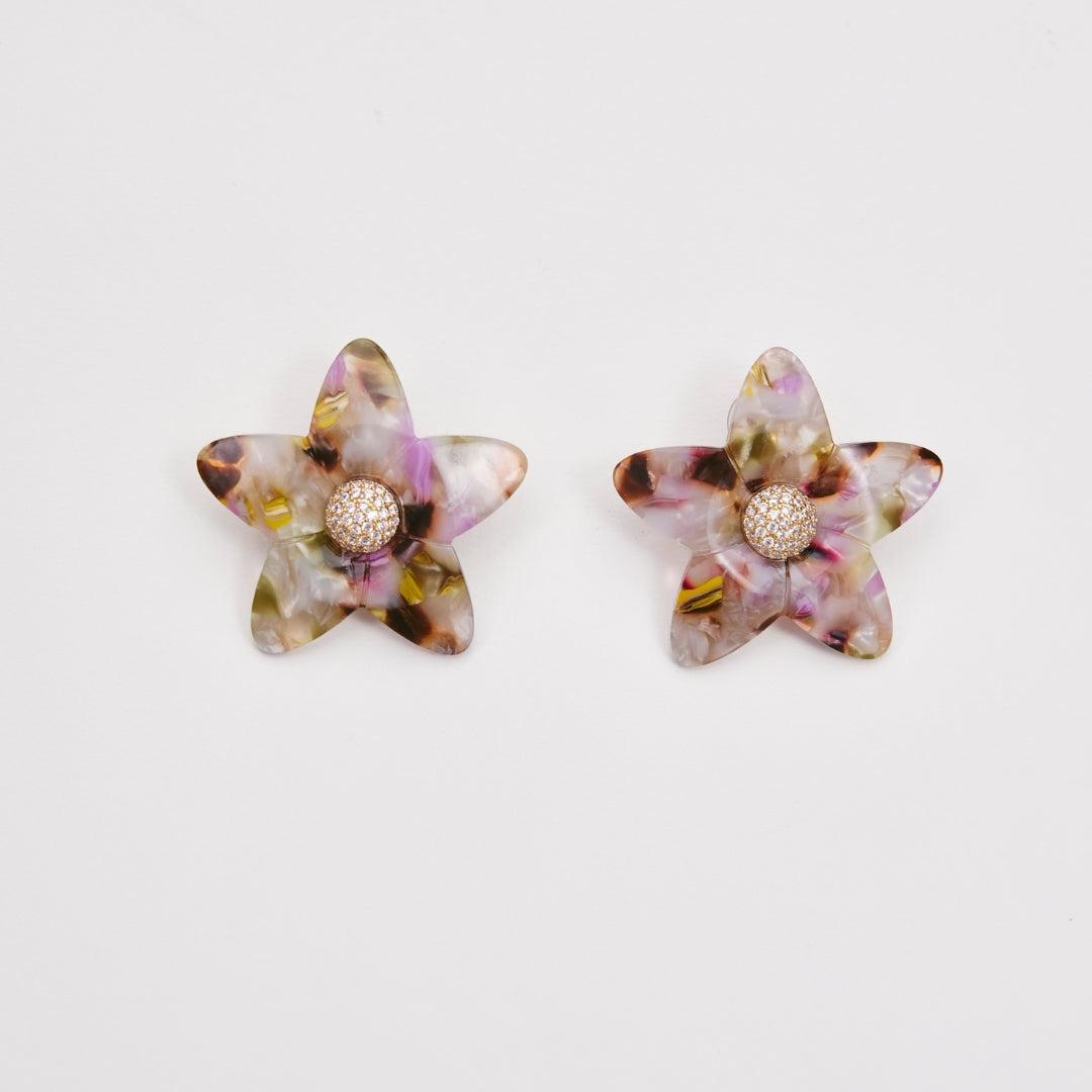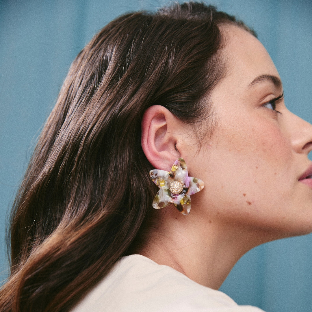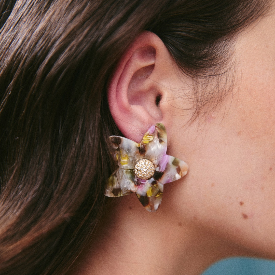 Flores grandes y vibrantes en acrílico, combinadas con cristales que aportan un toque brillante y elegante.