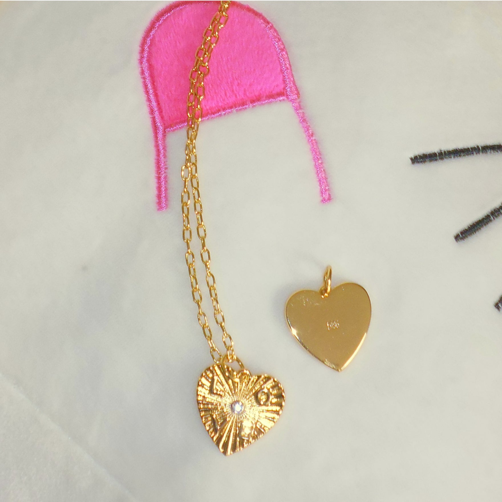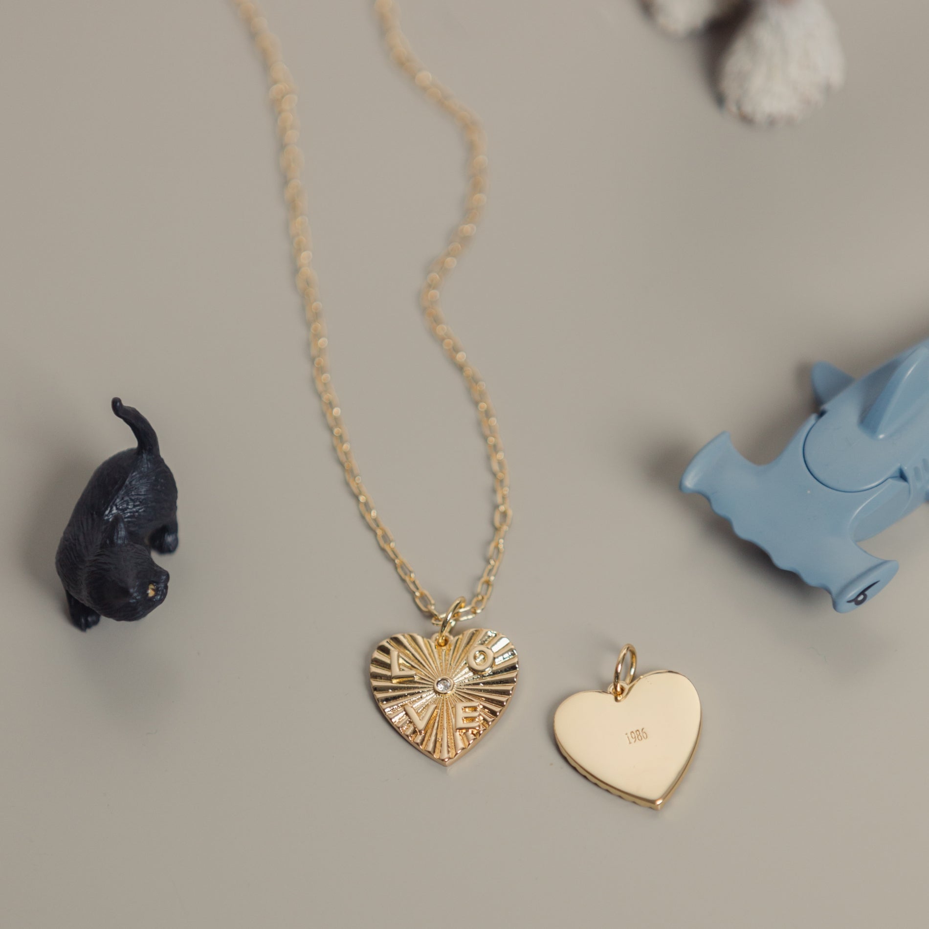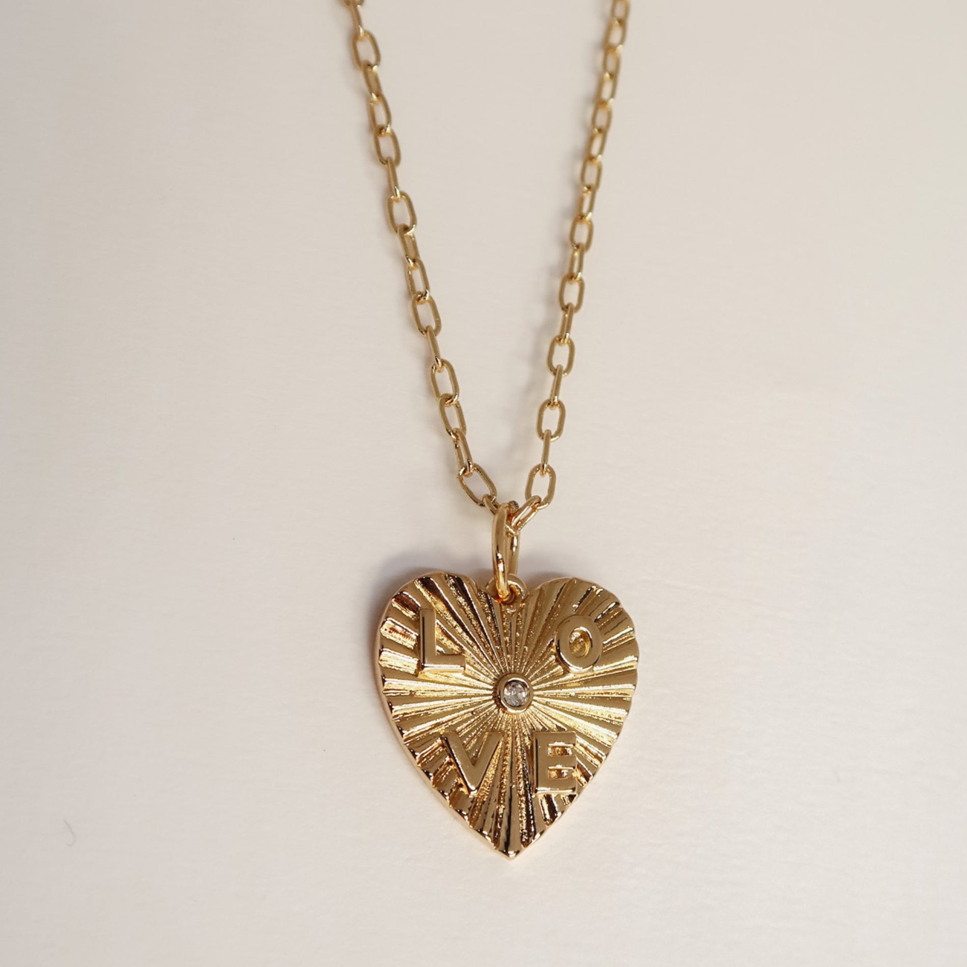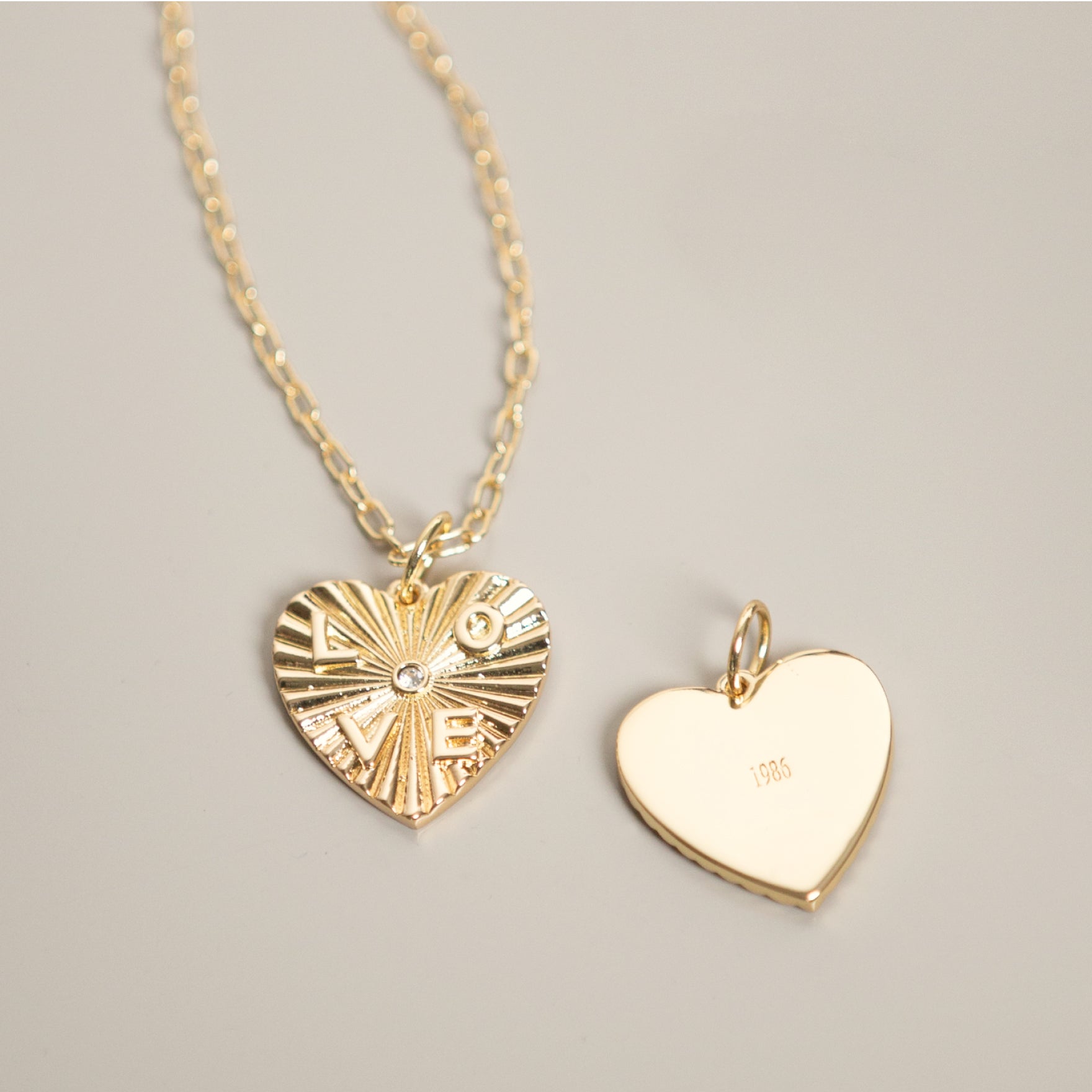 El corazón lleva un cristal en el centro simbolizando el amor incondicional y lleva la palabra LOVE grabada en bajo relieve.